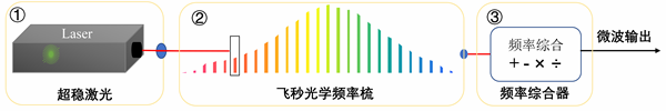 超穩(wěn)光生微波源主要由超穩(wěn)激光器、飛秒光學(xué)頻率梳和微波頻率綜合器這三部分組成,如圖 5所示。超穩(wěn)激光器提供超級(jí)穩(wěn)定的單頻激光信號(hào),它是超穩(wěn)微波的參考源,它的頻率穩(wěn)定度制約著所產(chǎn)生的微波的頻率穩(wěn)定度。飛秒光學(xué)頻率梳用來搭建一條連接超穩(wěn)激光信號(hào)和超穩(wěn)微波信號(hào)的橋梁,讓超穩(wěn)激光直接將頻率穩(wěn)定度傳承給超穩(wěn)微波,得到光生微波信號(hào)。微波頻率綜合器,可以將飛秒光梳傳遞的微波信號(hào)變換至任意希望的頻率值上。