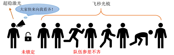 如果把超穩(wěn)光生微波源比作排隊(duì)走的隊(duì)列,那么超穩(wěn)激光就像隊(duì)列里面的帶隊(duì)人,隊(duì)伍的步伐大小、整齊度、每位隊(duì)員的相對(duì)位置都由這個(gè)領(lǐng)隊(duì)決定。飛秒光梳就像隊(duì)列里面的隊(duì)員,在沒有和超穩(wěn)激光建立聯(lián)系之前,光梳是自由運(yùn)轉(zhuǎn)的,就如圖 6中所示的一樣混亂。而當(dāng)通過一系列復(fù)雜的操作和領(lǐng)隊(duì)建立聯(lián)系后,就能使得每位隊(duì)員的步伐大小、步速、以及和其他隊(duì)員的相對(duì)位置都和領(lǐng)隊(duì)高度同步,如同圖 7所示,這樣就產(chǎn)生的超穩(wěn)光生微波信號(hào)。