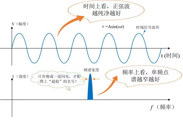 從時(shí)間尺度上看,超穩(wěn)微波信號(hào)是指周期連續(xù)、頻率單一的正弦波;而從頻率尺度上看,超穩(wěn)微波信號(hào)是頻譜寬度很窄的信號(hào)。如圖2。時(shí)間上信號(hào)的波形越逼近正弦波,頻率成分就越單一、穩(wěn)定度就越穩(wěn)定,頻域上信號(hào)的譜線寬度越窄,相位噪聲就越低。