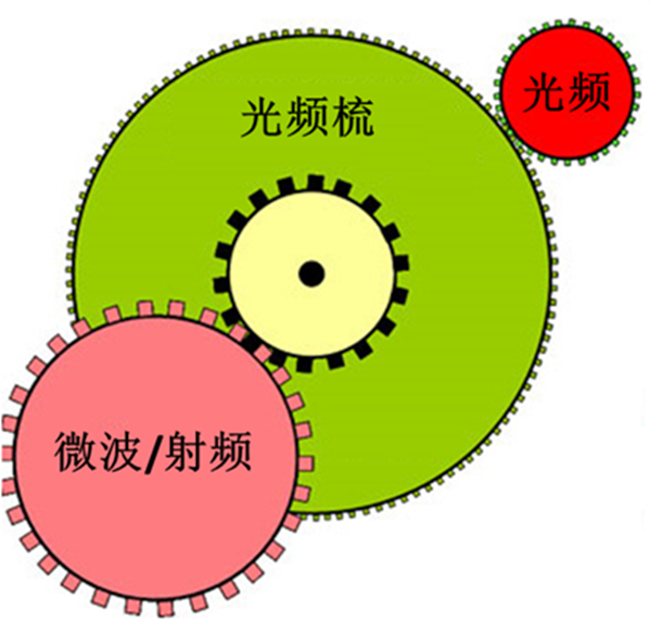 雖然激光的頻率很穩(wěn)定,但是激光的頻率卻很高,和微波頻率相比,一般要差5、6個(gè)數(shù)量級(jí)。因此無法直接對(duì)激光進(jìn)行分頻而抑制了光生微波技術(shù)的發(fā)展。而在2000年, Theodor W. H?nsch教授和John L. Hall教授發(fā)明了光學(xué)頻率梳[3][4],就像一個(gè)齒輪組(如圖 9),既可以嚙合激光頻率,又可以連接微波頻率,可以直接對(duì)超穩(wěn)激光進(jìn)行分頻至微波頻率,這項(xiàng)技術(shù)的發(fā)明使得光生微波成為可能。這兩位科學(xué)家也因?yàn)榘l(fā)明光梳而分享了2005年諾貝爾物理學(xué)獎(jiǎng)。